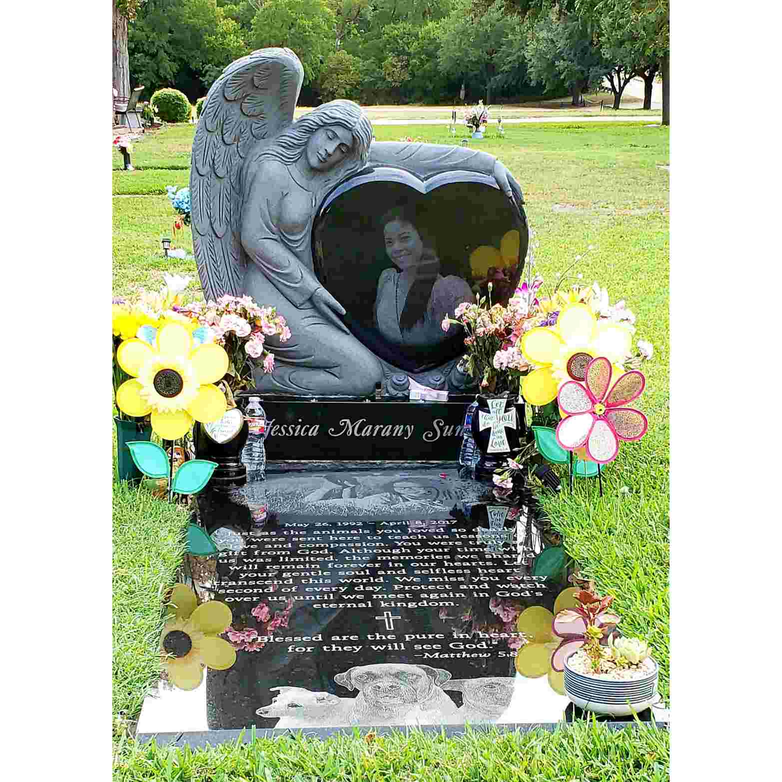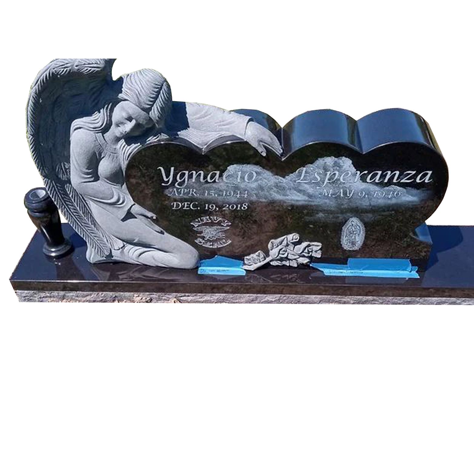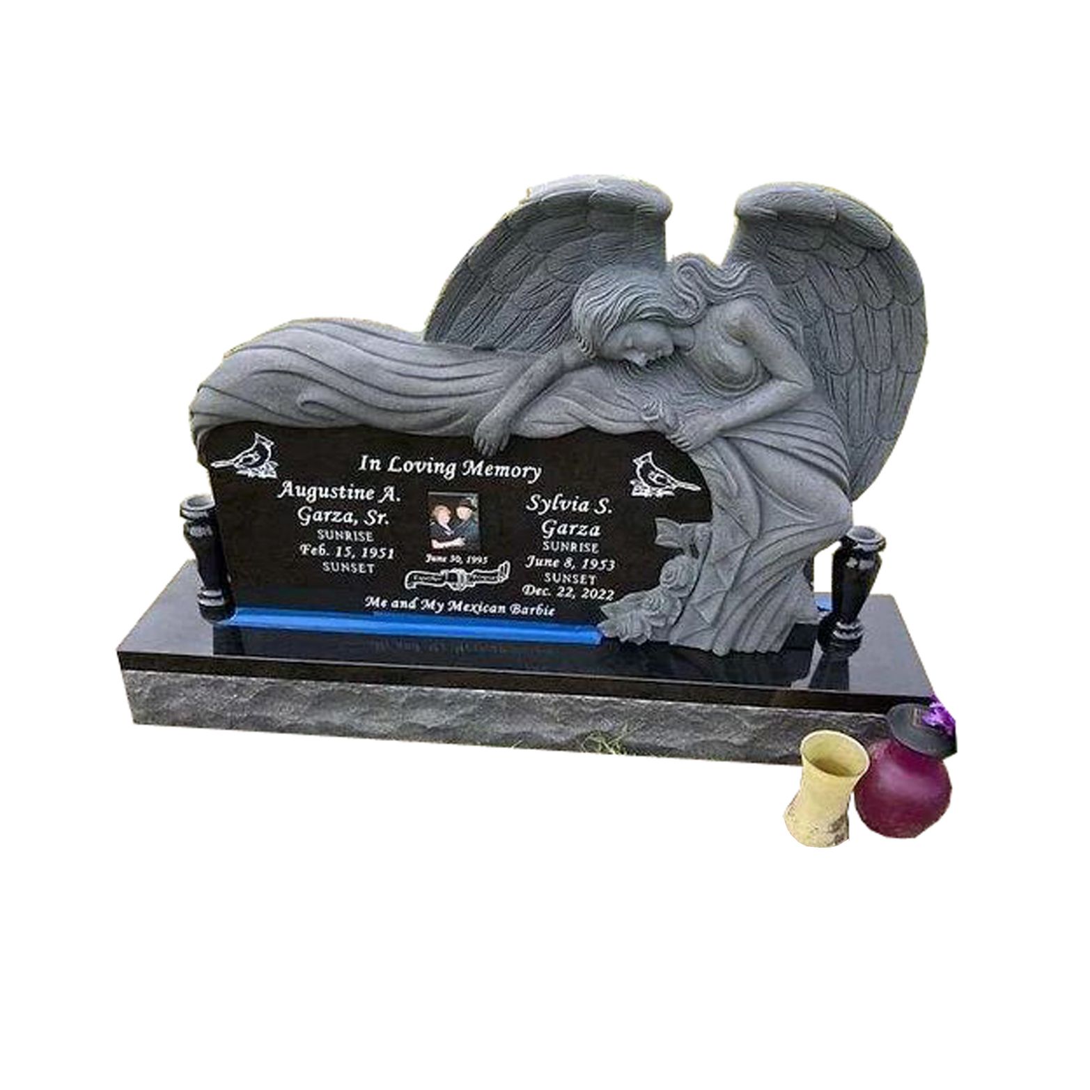 ຈຸດໃຈກາງຂອງ tombstone ນີ້ແມ່ນທູດທີ່ມີການແກະສະຫຼັກທີ່ສວຍງາມ, ເປັນສັນຍາລັກສະແດງຄວາມຫວັງ, ຄວາມເຊື່ອ, ຄວາມເຊື່ອ, ແລະຄວາມສະຫງົບສຸກ. ປີກທີ່ລະອຽດອ່ອນຂອງທູດສະຫວັນໃຫ້ບ່ອນຝັງສົບມີຄວາມຮູ້ສຶກທີ່ອົບອຸ່ນແລະສະດວກສະບາຍ.