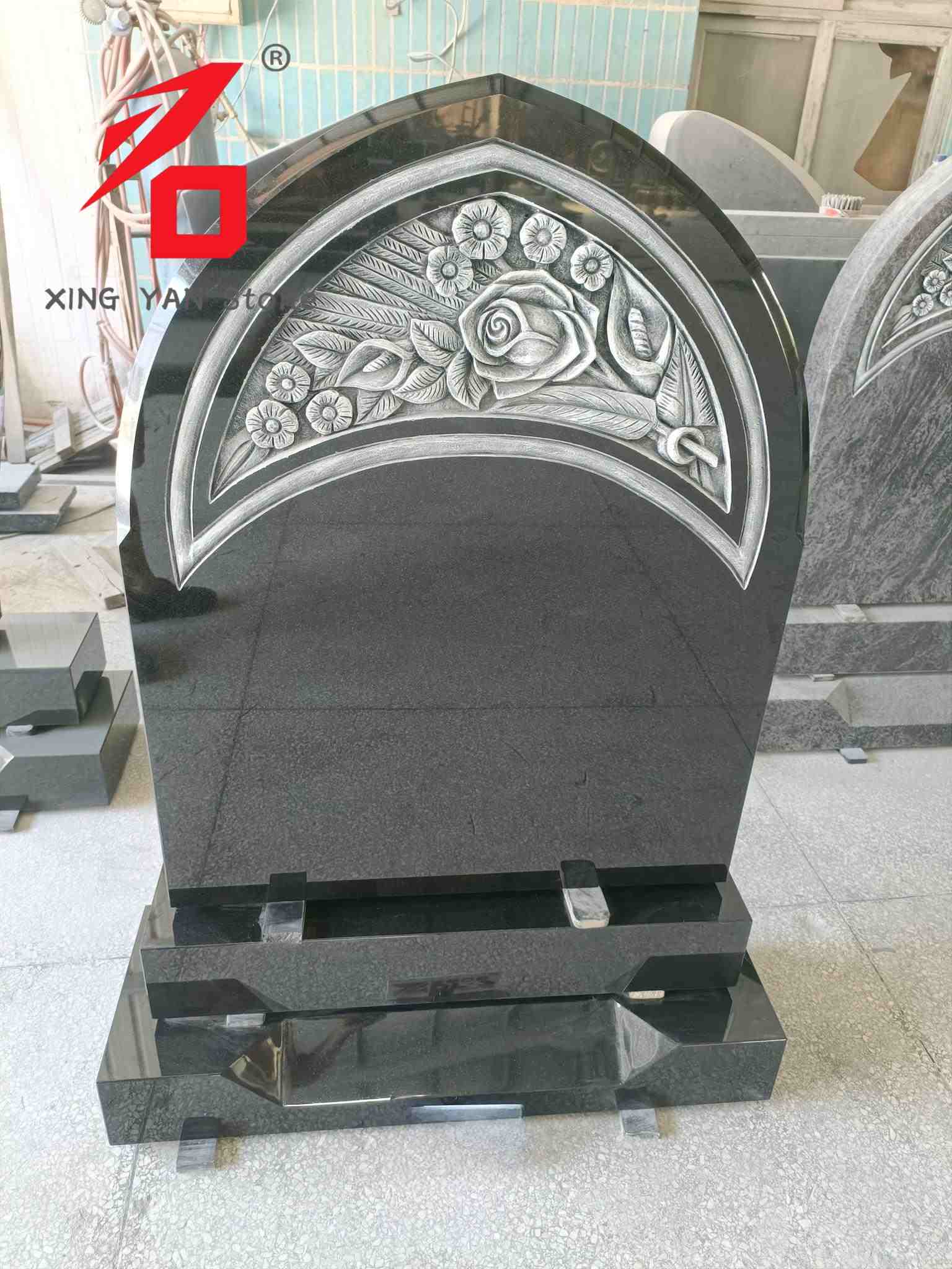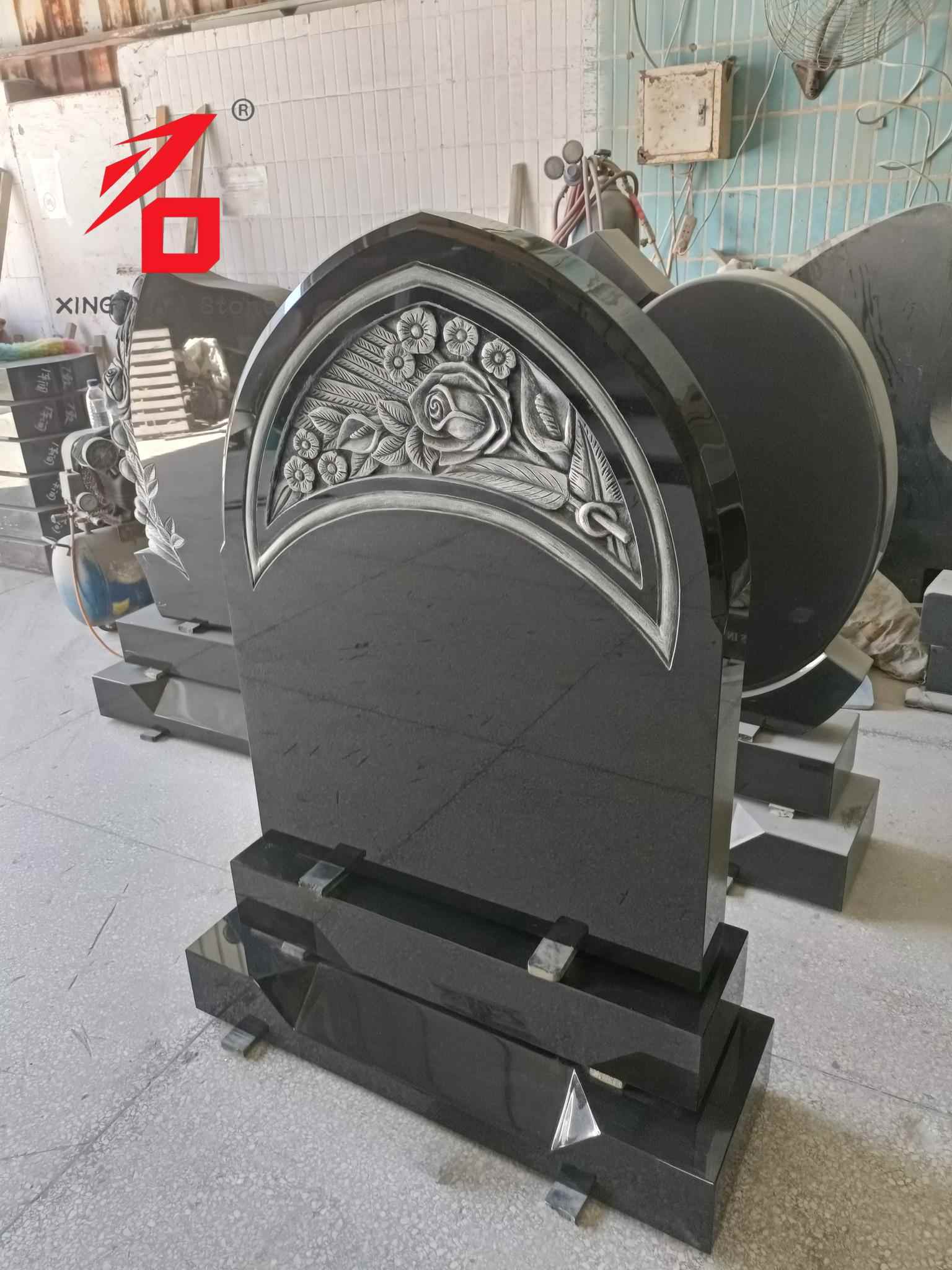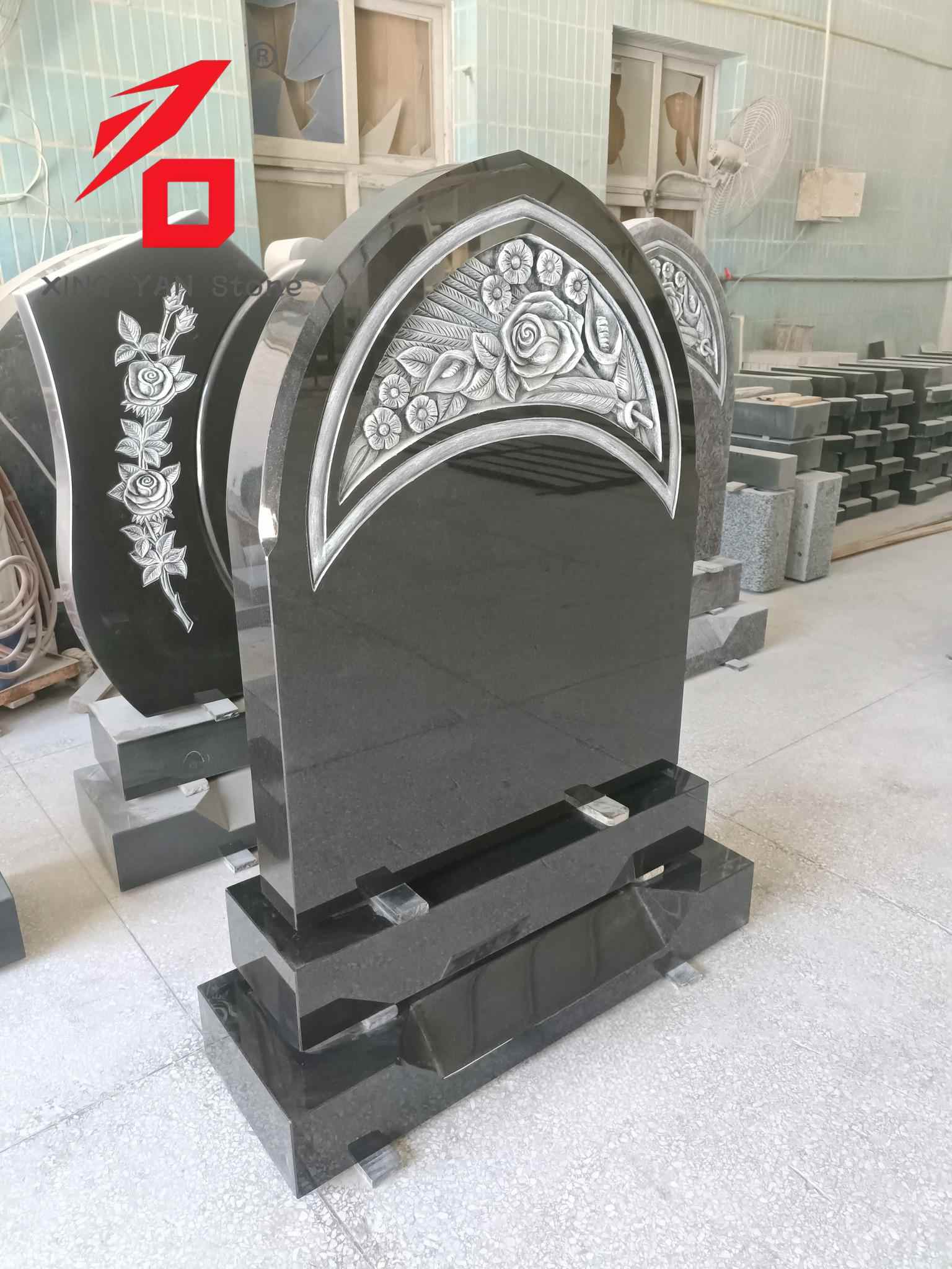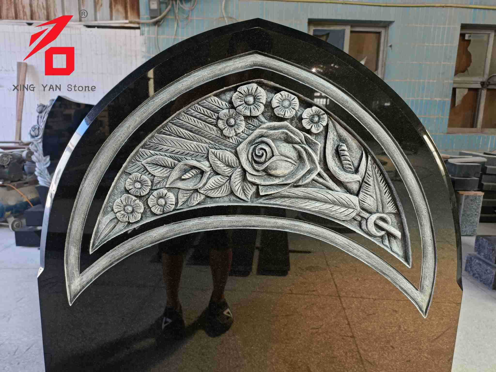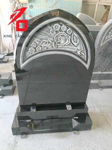 ແບບອອກແບບ: ຮູບຊົງໂຄ້ງທີ່ມີຮູບຮ່າງໂຄ້ງພ້ອມດ້ວຍອົງປະກອບການບັນເທົາທຸກດອກກຸຫລາບທີ່ລວມເອົາຄວາມອ່ອນໂຍນແລະຄວາມສຸພາບທີ່ເຫມາະສົມກັບການສະແດງຄວາມຊົງຈໍາຂອງຜູ້ຕາຍ.